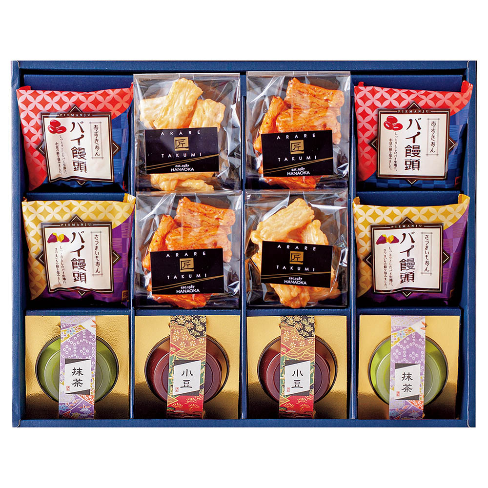 パイ饅頭(小豆・さつまいも)×各2、羊羹(小豆・抹茶)×各2、あられ(旨塩 ・香ばし醤油)×各2