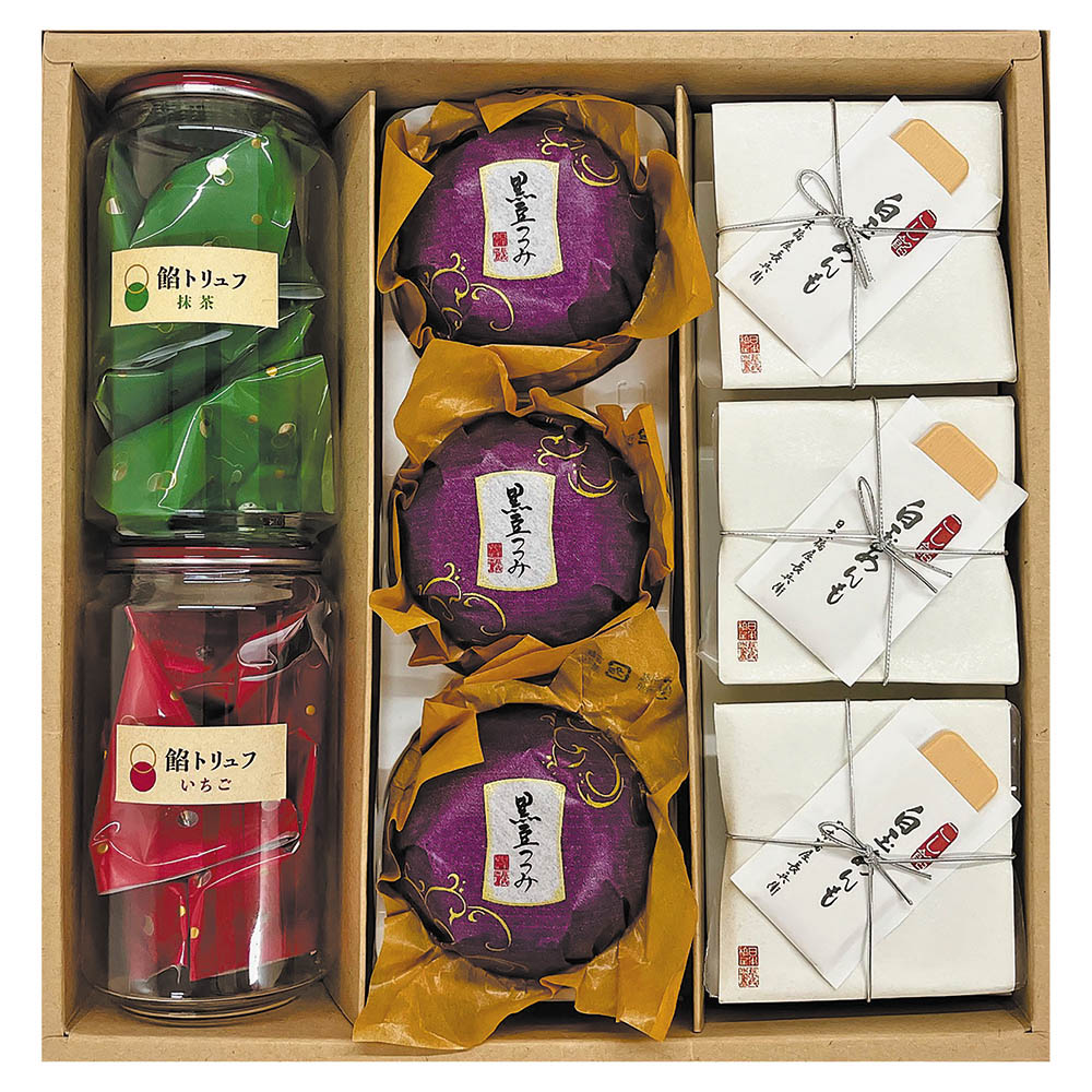 黒豆つつみ・白玉あんも×各3、餡トリュフ(いちご・抹茶)×各5