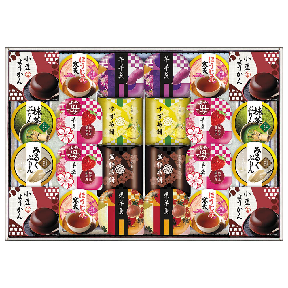 小豆ようかん 70g×4、ぷりん(抹茶・みるく 各45g×2)、ほうじ茶寒天 45g×4、羊羹(苺 64g×4、芋・栗 各64g×2)、葛餅(ゆず・黒糖 各70g×2)