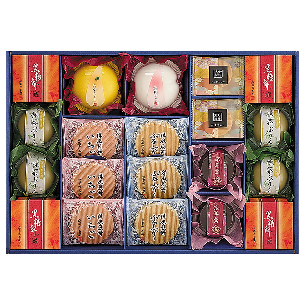 洋風煎餅(いちご・ぶるーべりー 各2枚入×3)、京羊羹 75g×2、和楽菓煎ばにら×6、プリン(みかん・白桃 各135g)、黒糖餅・抹茶ぷりん 各64g×4
