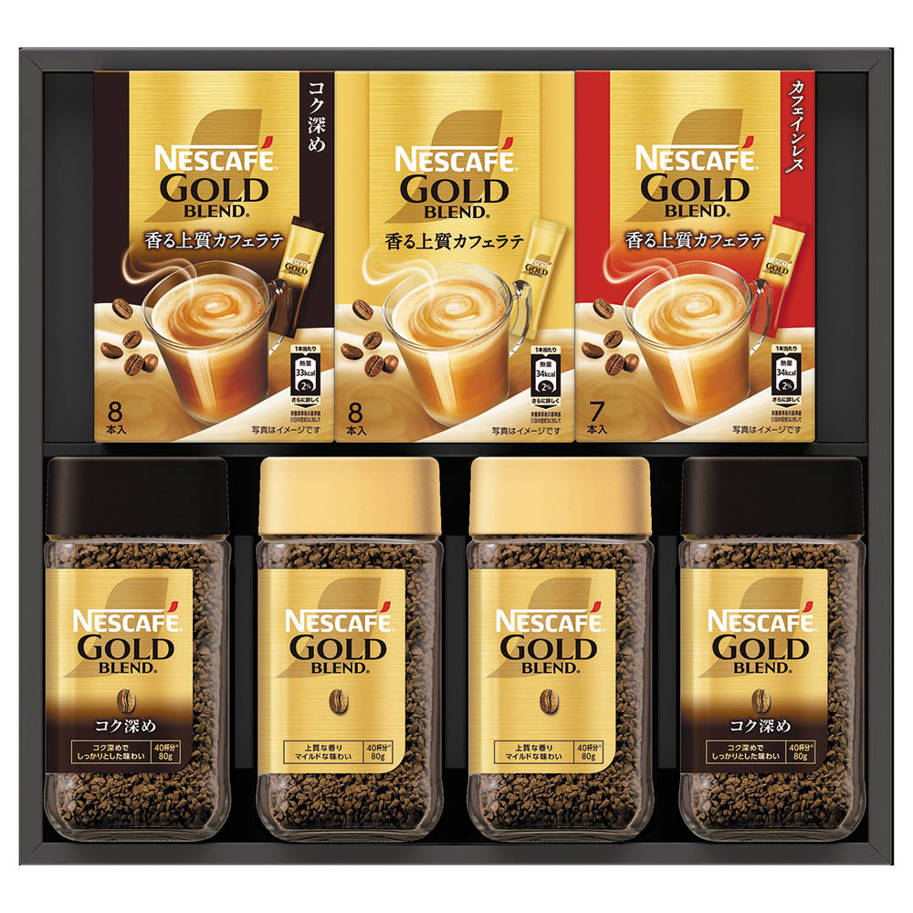 ゴールドブレンド(オリジナル・コク深め 各80g×2)、ゴールドブレンドスティック カフェラテ(オリジナル・コク深め 各8p、カフェインレス 7p)