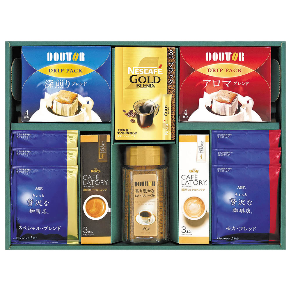 カフェラトリー(R)(濃厚ミルク・濃厚ビター×各3)、ちょっと贅沢な珈琲店(R)ドリップパック(スペシャルブレンド・モカブレンド 各7g)×3、ドトールドリップパック(深煎りブレンド・アロマブレンド 各7g)×4、ネスカフェゴールドブレンドスティックブラック×8、ドトールインスタントコーヒー香り豊かなおいしい一杯 60g