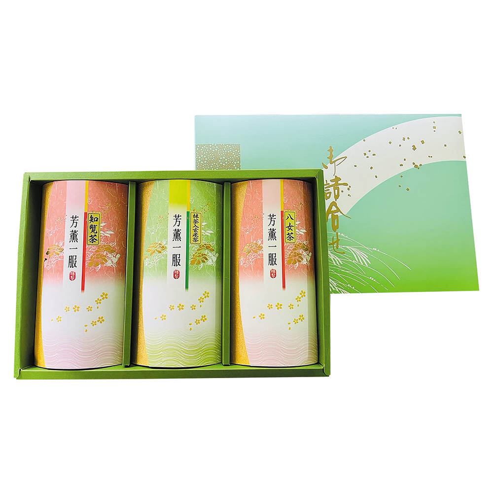 八女茶 70g、抹茶入り玄米茶 70g、知覧茶 70g