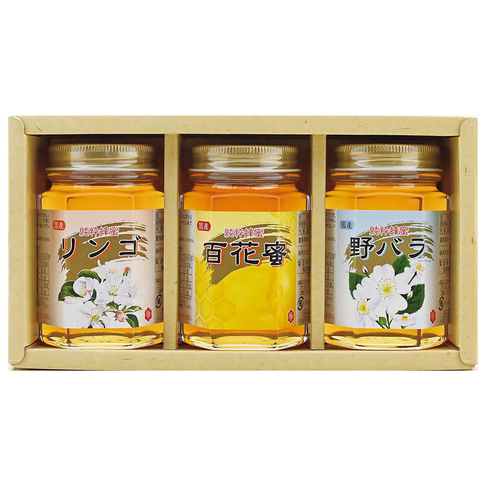 国産リンゴ蜂蜜・国産百花蜜・国産野バラ蜂蜜 各180g