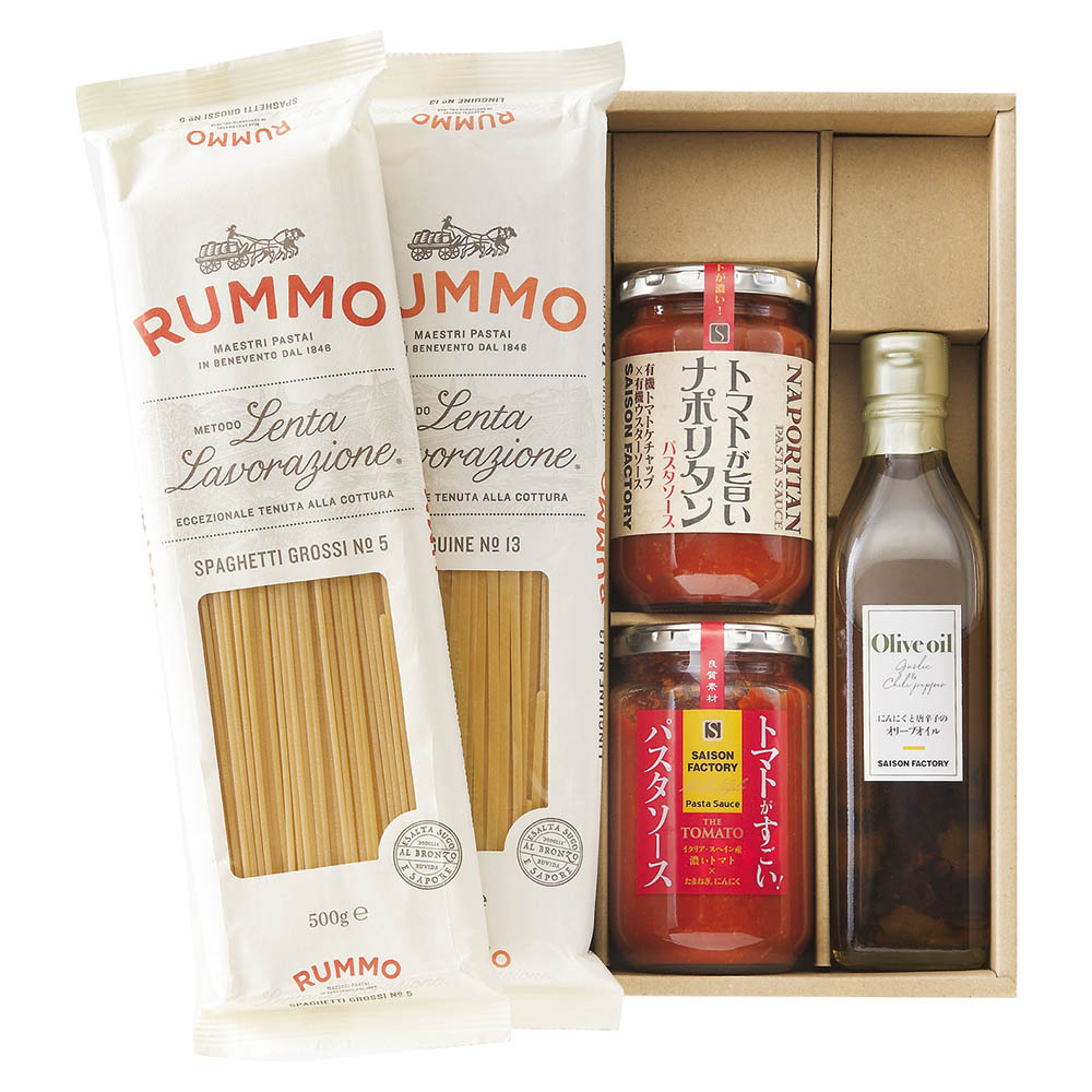 スパゲティグロッシ・リングイネ 各500g、ナポリタンソース 300g、パスタソーストマト 290g、オイルソースガーリック 270ml