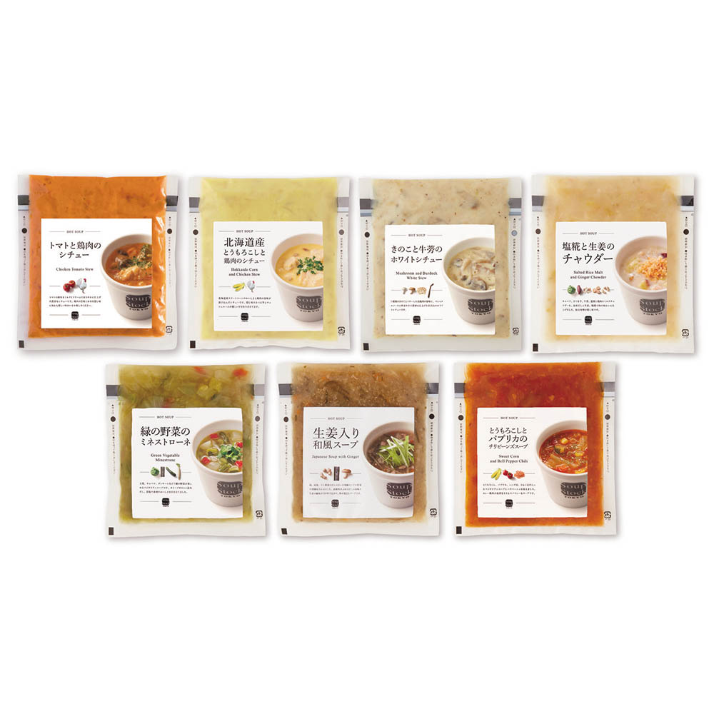 トマトと鶏肉のシチュー・北海道産とうもろこしと鶏肉のシチュー・きのこと牛蒡のホワイトシチュー・塩糀と生姜のチャウダー・緑の野菜のミネストローネ・生姜入り和風スープ・とうもろこしとパプリカのチリビーンズスープ 各180g