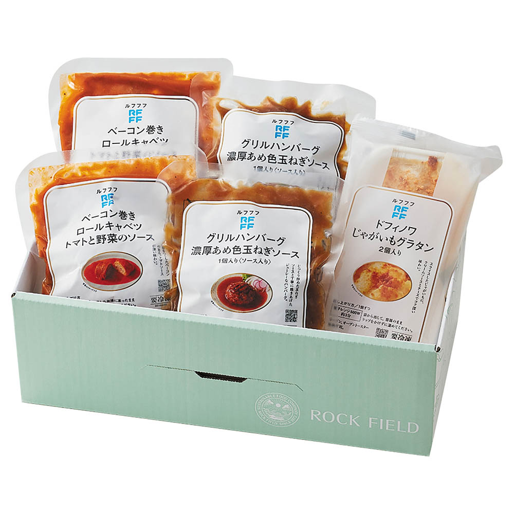 グリルハンバーグ 濃厚あめ色玉ねぎソース・ベーコン巻きロールキャベツ トマトと野菜のソース×各2、ドフィノワ じゃがいもグラタン(2個入り)