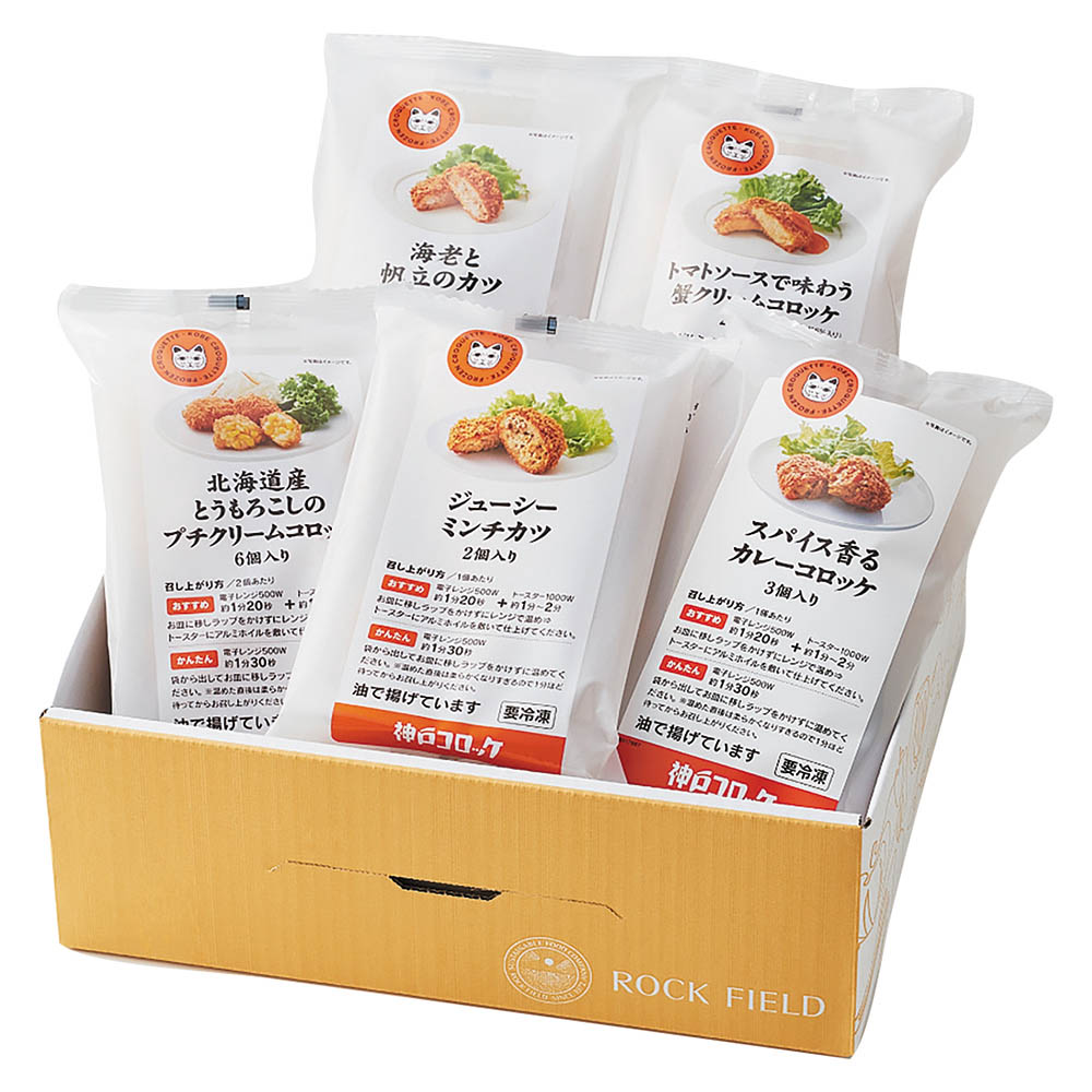 北海道産とうもろこしのプチクリームコロッケ(6個入り)、トマトソースで味わう 蟹クリームコロッケ(2個入り)、海老と帆立のカツ(2個入り)、ジューシーミンチカツ(2個入り)、スパイス香るカレーコロッケ(3個入り)