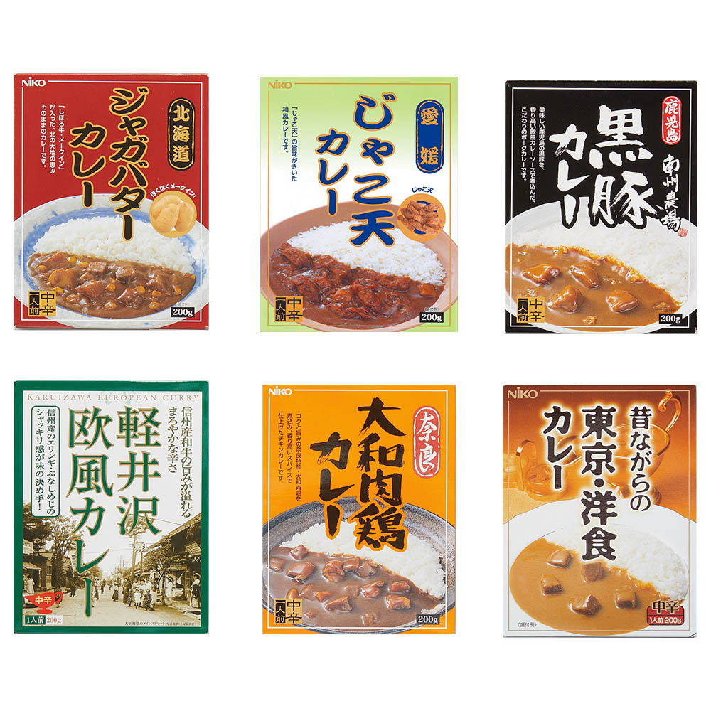 鹿児島南州農場黒豚カレー・軽井沢欧風カレー・愛媛じゃこ天カレー・北海道ジャガバターカレー・奈良大和肉鶏カレー・昔ながらの東京洋食カレー 各200g