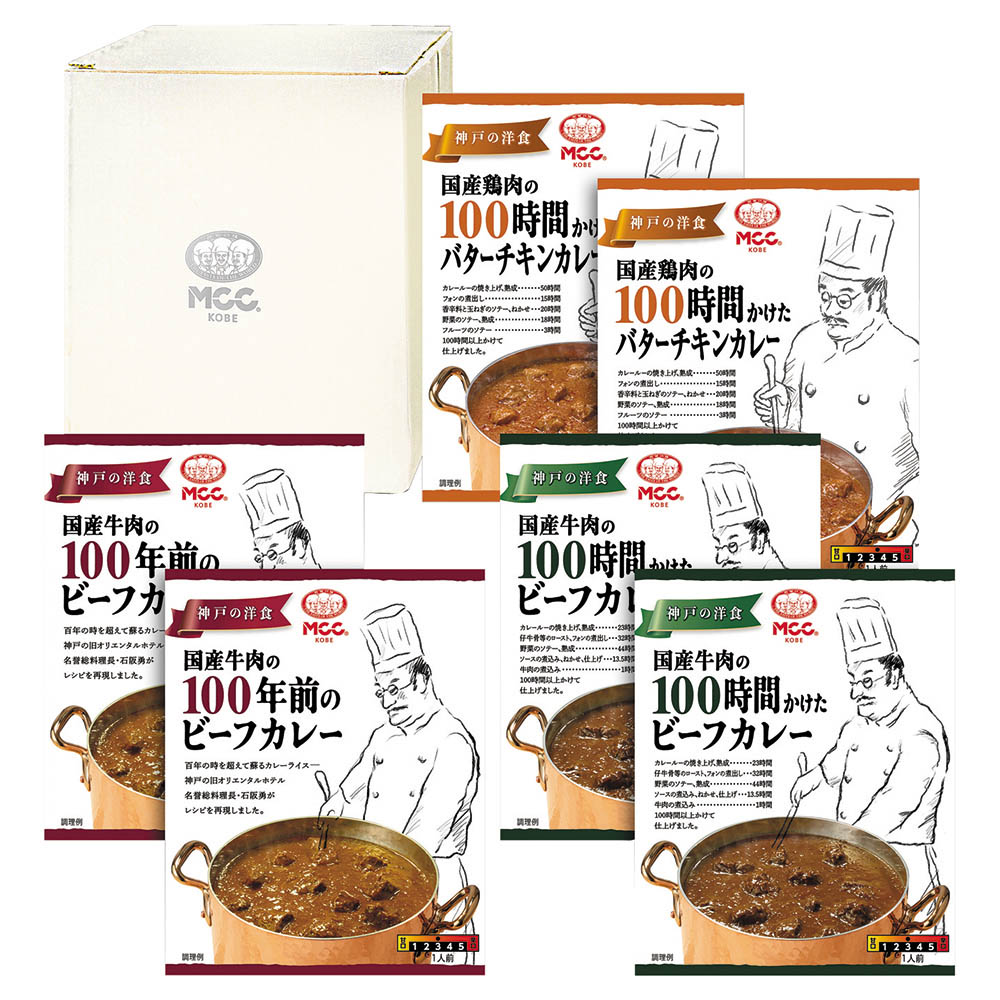 国産牛肉の100時間かけたビーフカレー・国産牛肉の100年前のビーフカレー 各180g×2、国産鶏肉の100時間かけたバターチキンカレー 165g×2