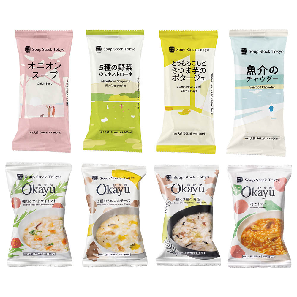 Okayu(2種のきのことチーズ、鶏肉とセミドライトマト、鯛と3種の海藻、梅とトマト)、Soup(5種の野菜のミネストローネ、魚介のチャウダー、オニオンスープ、とうもろこしとさつまいものポタージュ)