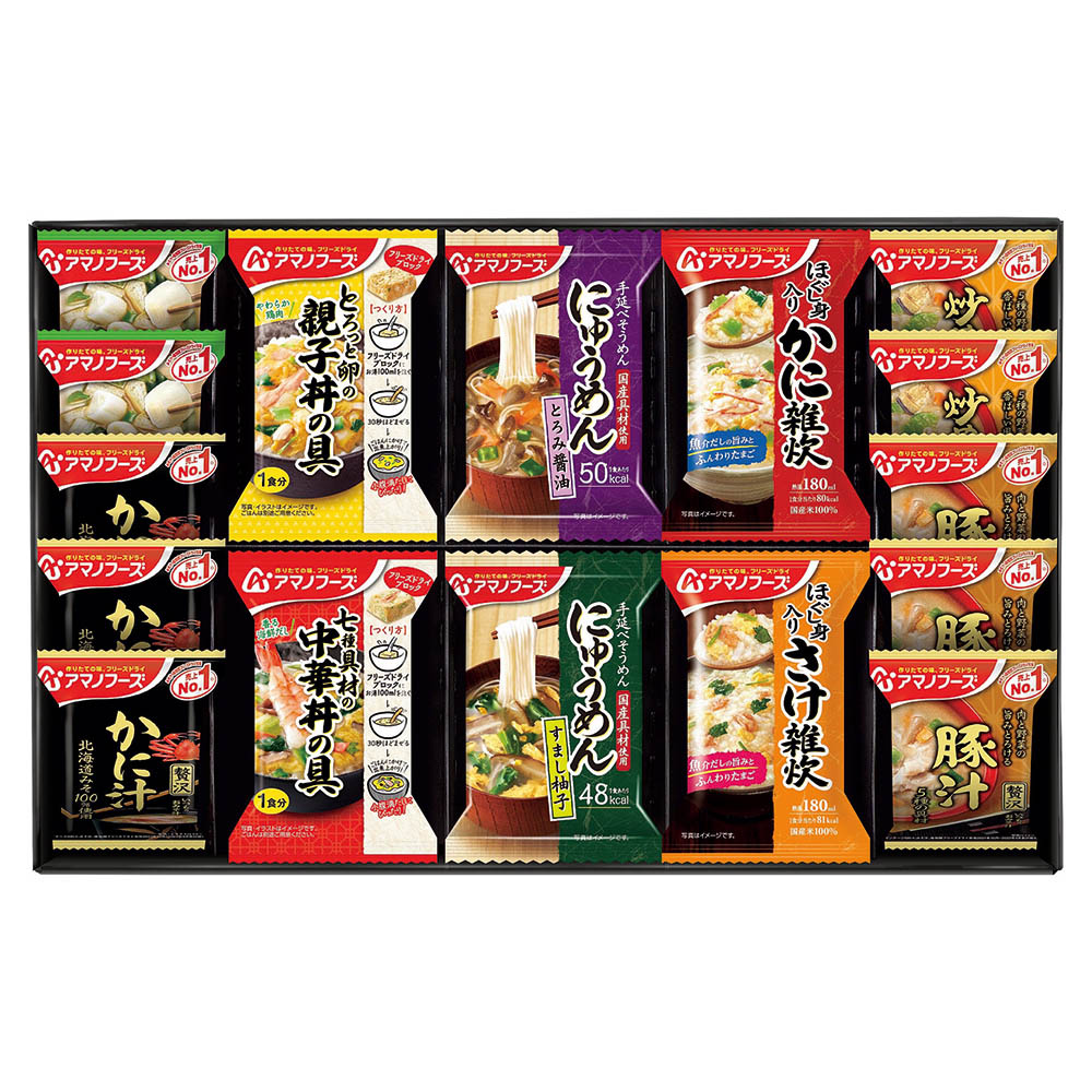 いつものおみそ汁贅沢(かに汁・豚汁×各3、炒め野菜×2)、いつものおみそ汁長ねぎ×2、親子丼の具・中華丼の具・にゅうめんとろみ醤油・にゅうめんすまし柚子・ほぐし身入りかに雑炊・ほぐし身入りさけ雑炊×各2