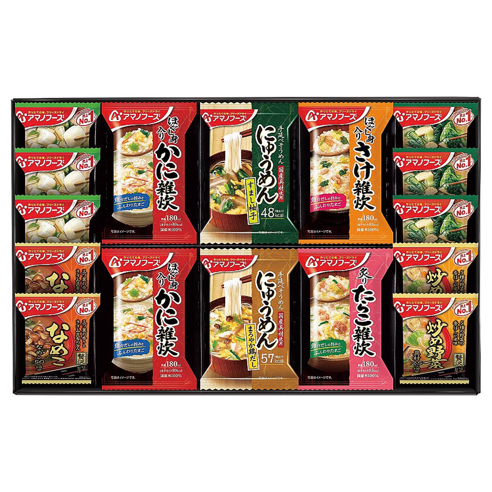 いつものおみそ汁(長ねぎ・ほうれん草×各3)、いつものおみそ汁贅沢(なめこ・炒め野菜×各2)、ほぐし身入りかに雑炊×2、ほぐし身入りさけ雑炊、炙りたらこ雑炊、にゅうめんすまし柚子、にゅうめんまろやか鶏だし