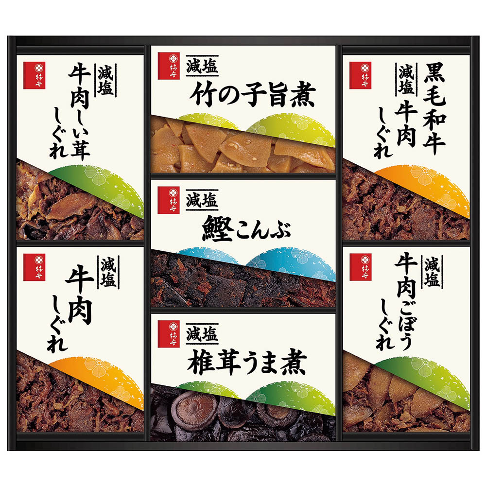 黒毛和牛減塩牛肉しぐれ・減塩牛肉しぐれ・減塩牛肉ごぼうしぐれ・減塩牛肉しい茸しぐれ・減塩鰹こんぶ・減塩竹の子旨煮 各50g、減塩椎茸うま煮 60g