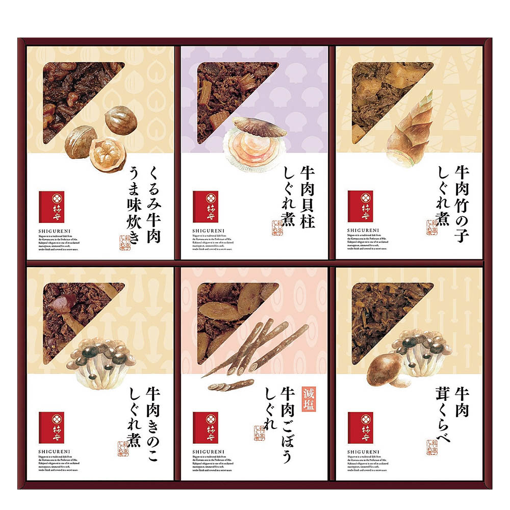 牛肉貝柱しぐれ煮・牛肉茸くらべ・減塩牛肉ごぼうしぐれ・牛肉竹の子しぐれ煮・牛肉きのこしぐれ煮・くるみ牛肉うま味炊き 各50g