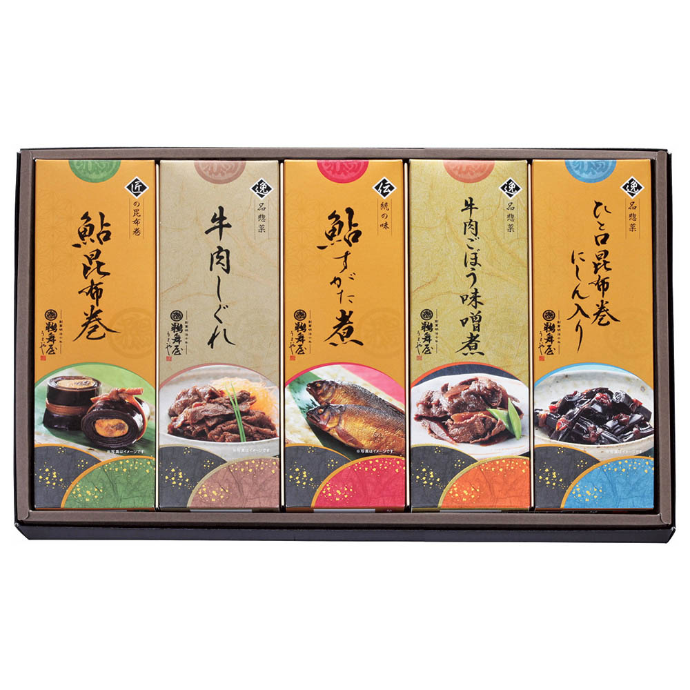 鮎昆布巻 190g、牛肉しぐれ 70g、鮎すがた煮 75g、牛肉ごぼう味噌煮 70g、ひと口昆布巻にしん入り 100g