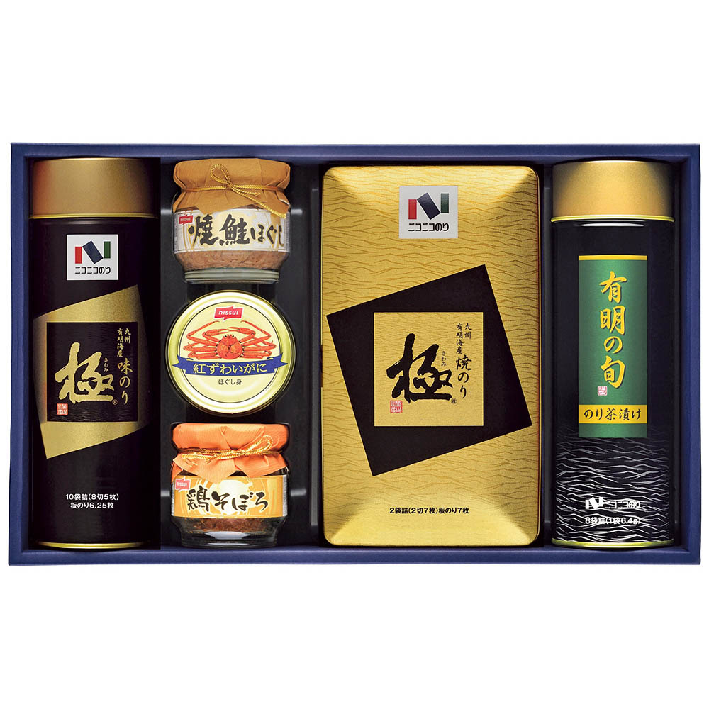 のり茶漬け 6.4g×8、味のり丸缶(8切5枚)×10、焼のり半裁缶(2切7枚)×2、紅ずわいがにほぐし身 55g、焼鮭ほぐし瓶・鶏そぼろ瓶 各50g