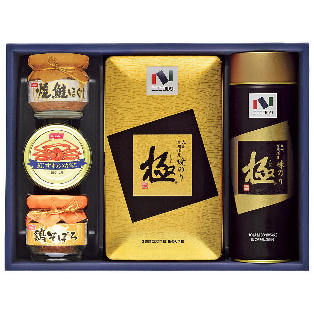 味のり丸缶(8切5枚)×10、焼のり半裁缶(2切7枚)×2、紅ずわいがにほぐし身 55g、焼鮭ほぐし瓶・鶏そぼろ瓶 各50g