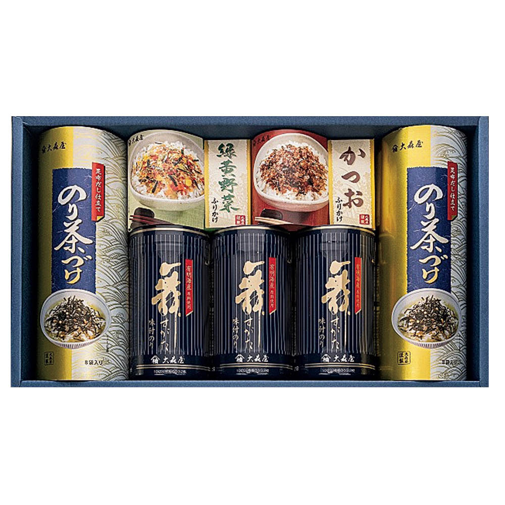 味付のり(10切32枚)×3、ふりかけ(緑黄野菜・かつお 各2.5g×10)、のり茶漬(5.4g×8袋)×2