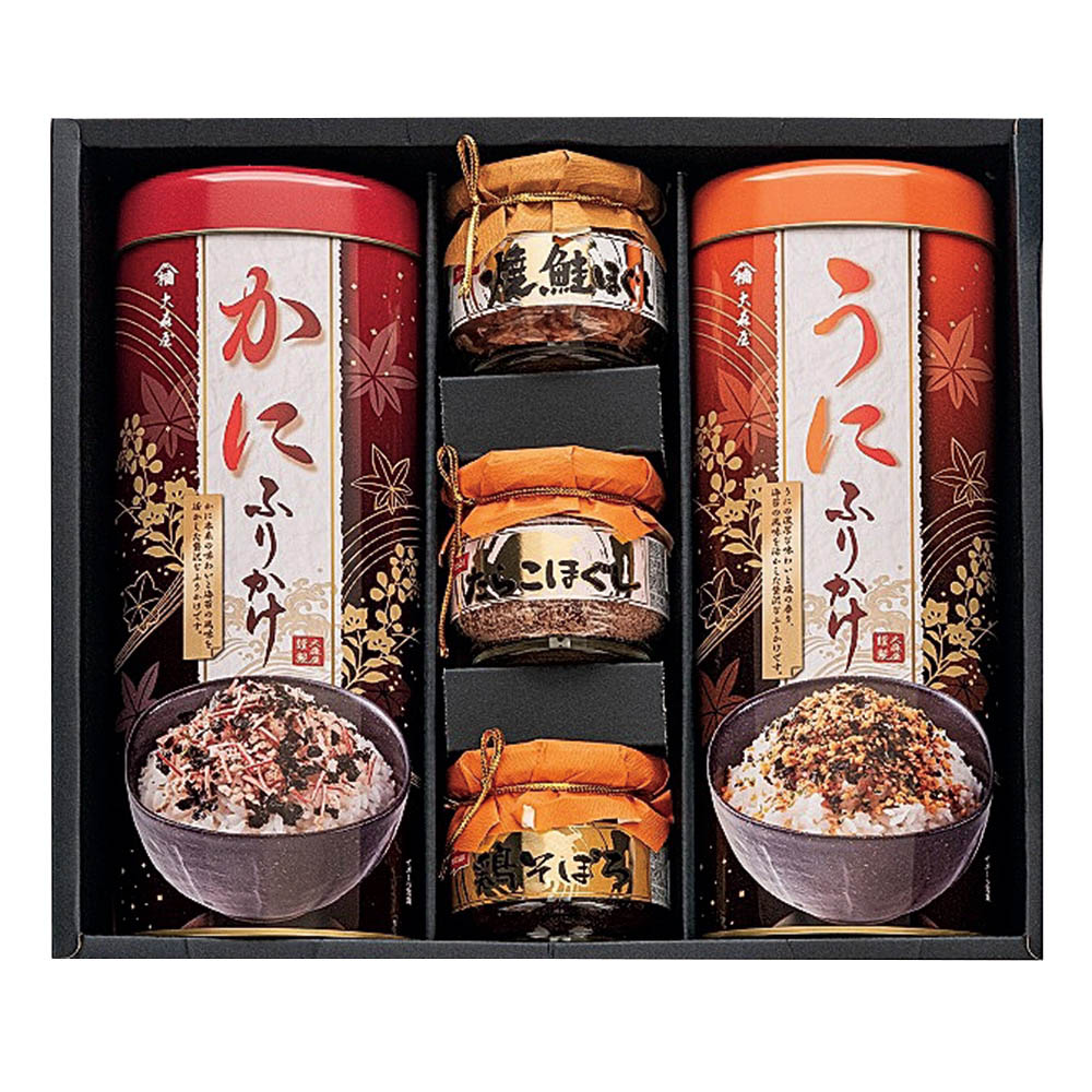 ふりかけ(かに・うに 各4.0g×8)、焼鮭ほぐし・たらこほぐし・鶏そぼろ 各50g