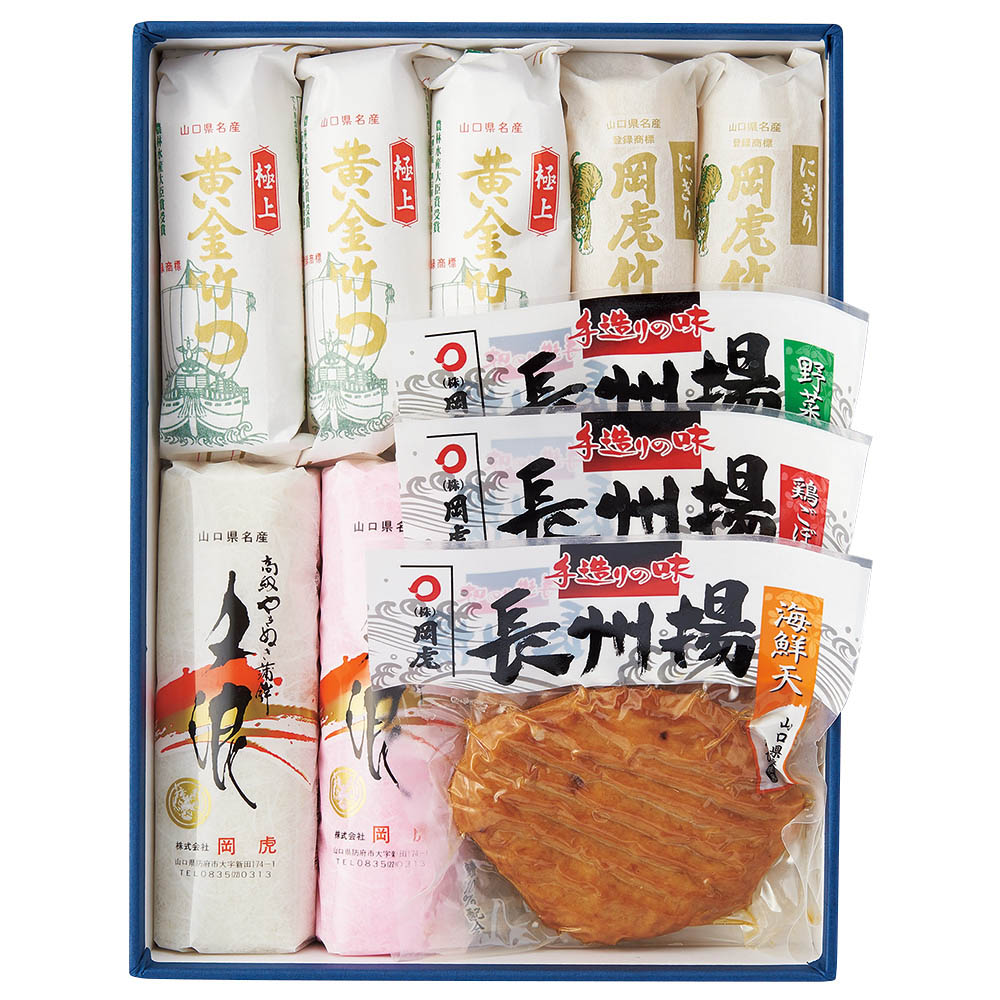 黄金ちくわ×3、にぎりちくわ×2、夕浪(大)赤・夕浪(大)白 各200g、長州揚(海鮮天、鶏ごぼう、野菜天)