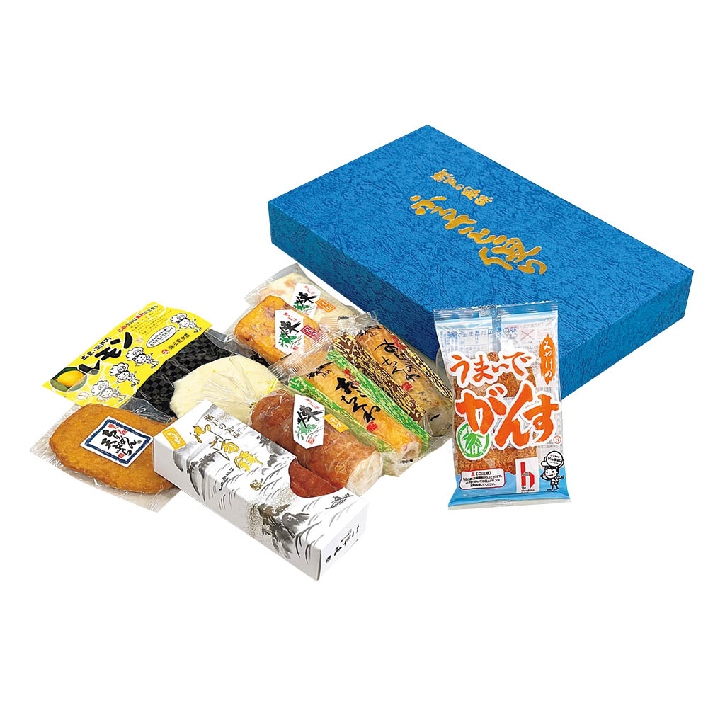たまご蒲鉾、あなご入り竹輪、たこ竹輪、うまいでがんす(2枚入)、レモン揚げ、ちりめん天、たこ天、えび天、チーズ万十(6個入)
