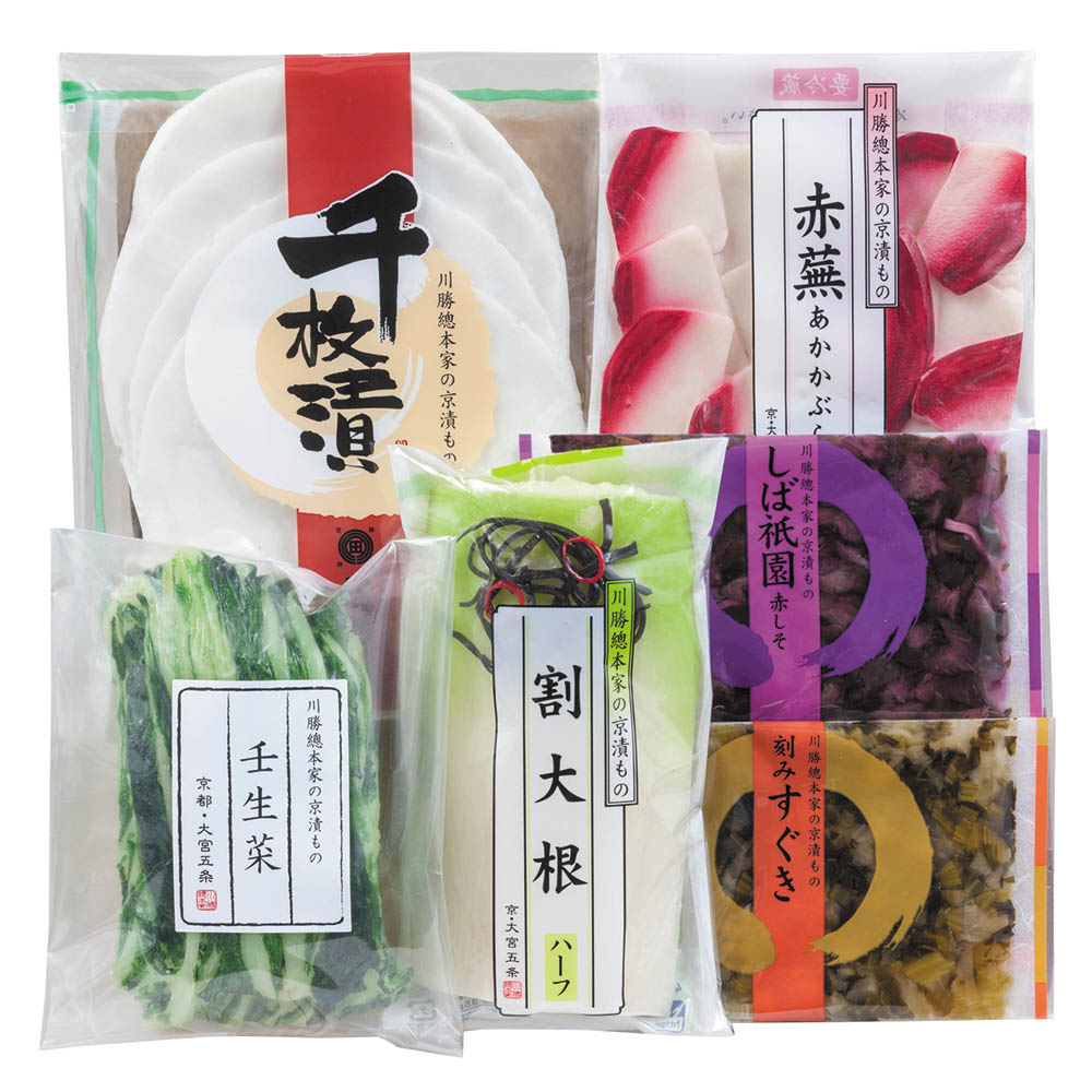 千枚漬 105g、壬生菜 100g、割大根ハーフ 1/4割、赤蕪 70g、しば祇園赤しそ 40g、刻みすぐき 40g