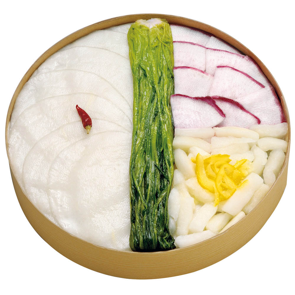 千枚漬 300g、壬生菜漬 90g、刻み赤かぶら 140g、柚子おとし 140g