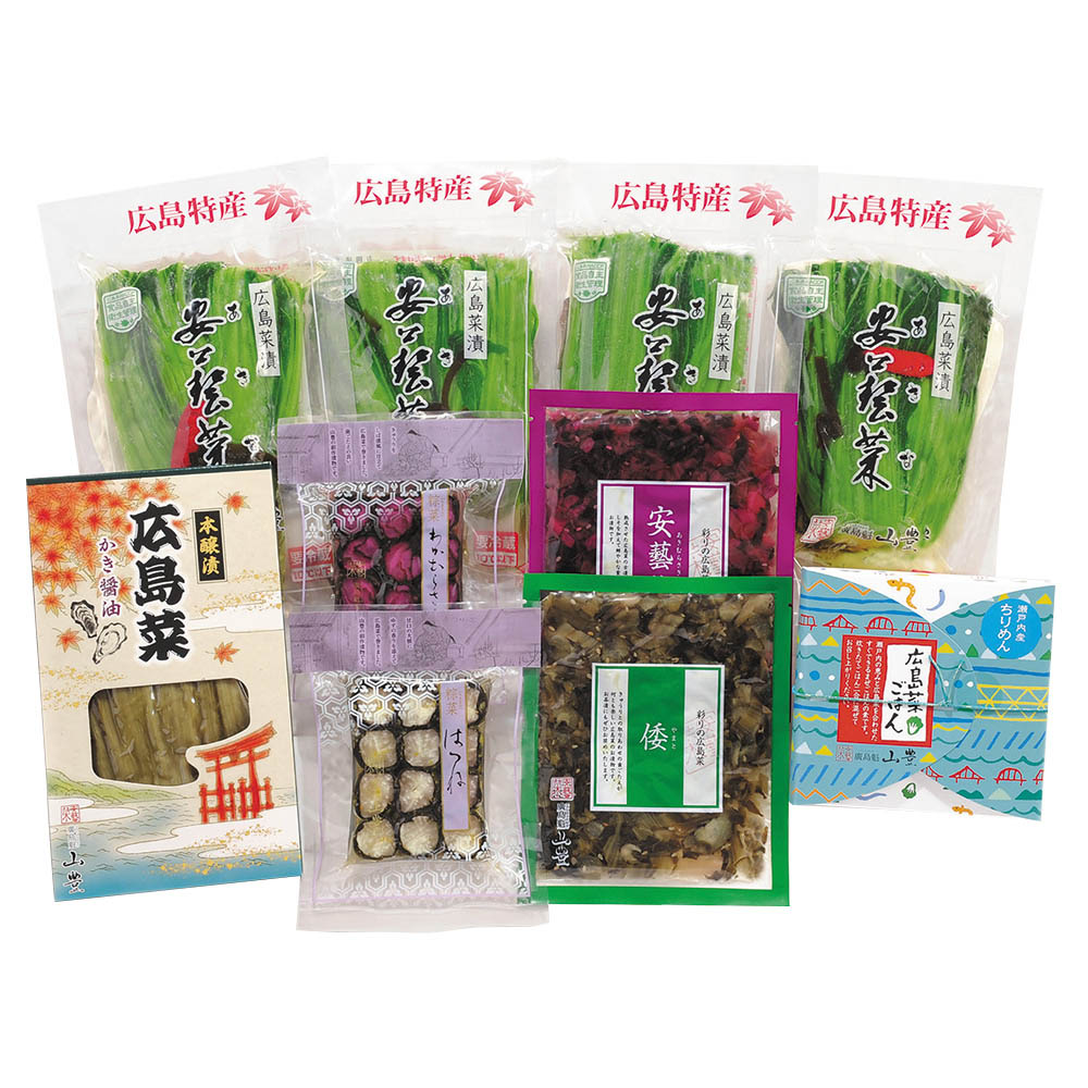 広島菜漬「安藝菜」 250g×4、安藝紫・倭 各90g、広島菜ごはん ちりめん 100g、本醸漬広島菜かき醤油 300g、はつね・わかむらさき 各12個入