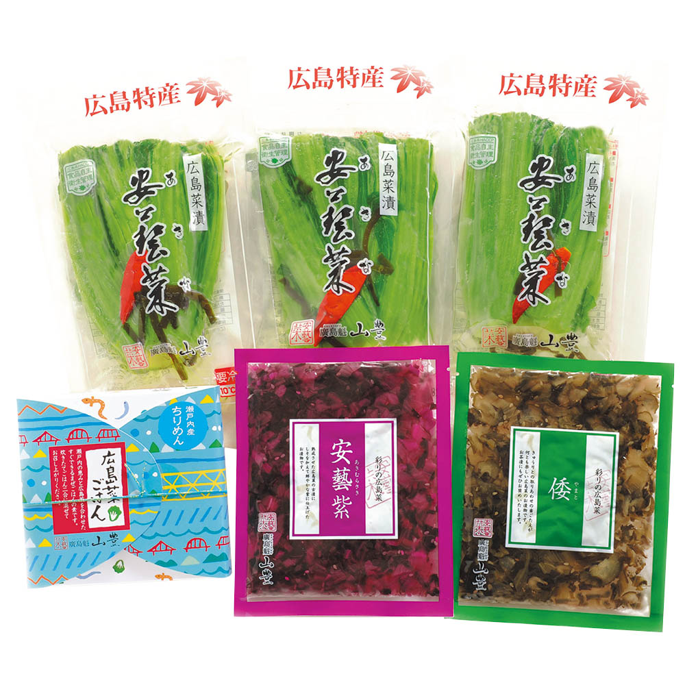 広島菜漬「安藝菜」 250g×3、安藝紫・倭 各90g、広島菜ごはん ちりめん 100g