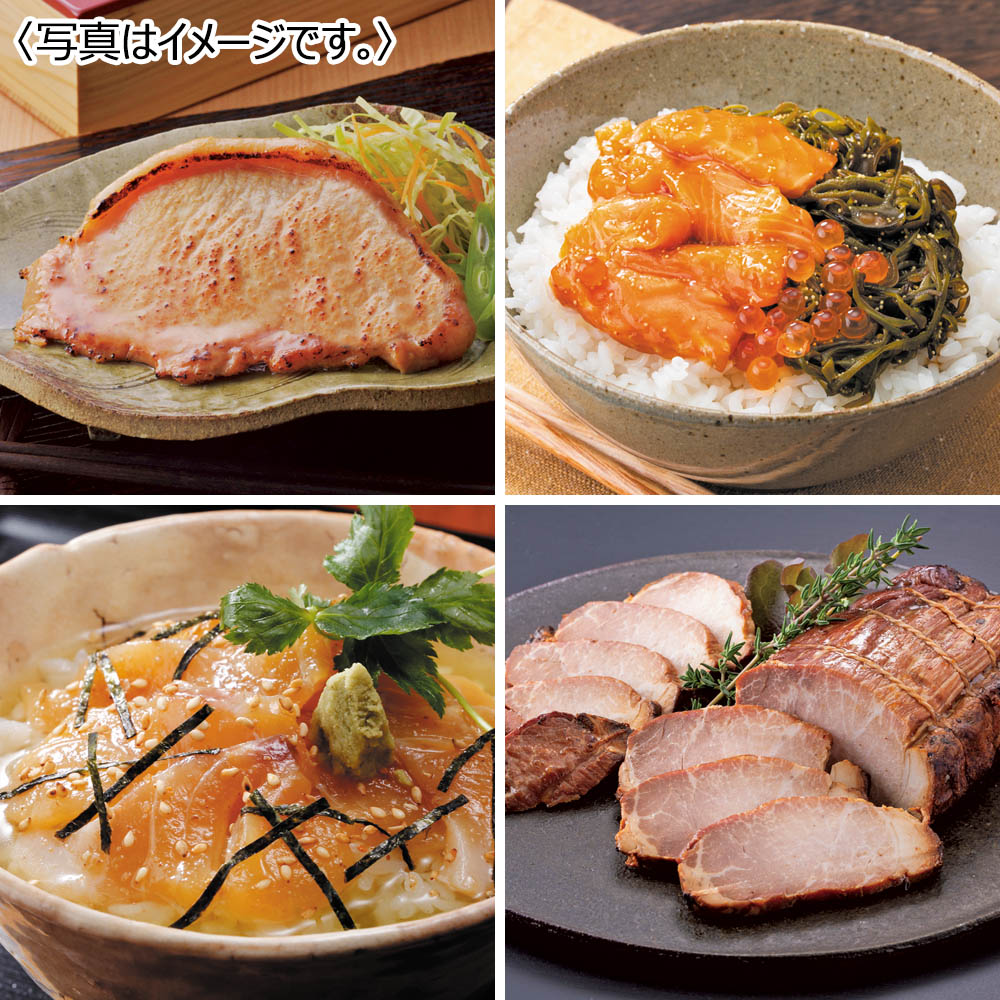 <唐津くん煙工房>豚寝る(とんねる)味噌漬(モモ) 75g×3 <川秀>たっぷり漬け サーモン100g <絆屋>鯛茶漬け70g×2 <山野井>炭で焼いた焼豚180g