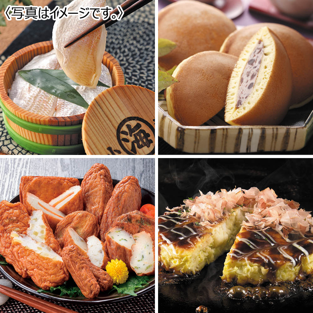 <小浜海産物>小鯛ささ漬70g <乳蔵>北海道十勝生どら70g×4 <中新商店>さつまあげ 中新Aパック(3種6個210g)、中新Bパック(3種8個208g) <千房>お好み焼(イカ豚ミックス) お好み焼(イカ豚ミックス)220g×2枚、千房ソース25g・ホワイトソース10g・あおさのり0.2g・かつお節1g×各2