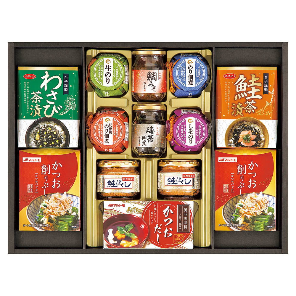 磯じまん(鯛みそ 100g・海苔佃煮 90g)、小豆島産佃煮(のり・しそのり・紀州梅のり・生のり 各80g)、マルトモ(かつお削りぶし 1.5g×4×2、かつおだし 8g×5)、鮭ほぐし 40g×2、白子のり(鮭茶漬 3.8g×3、わさび茶漬 3.3g×3)