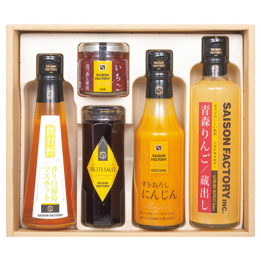 飲む酢マスカット 160ml、リッチスタイルジャムいちご 70g、フルーツソースブルーベリー 140g、リッチスタイルドレッシングにんじん 180ml、りんごジュース 270g