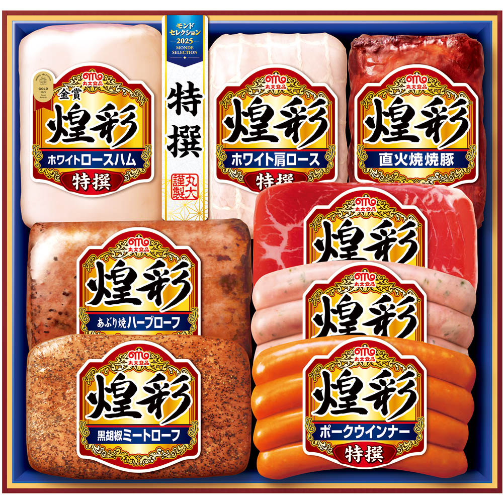 特撰ホワイトロースハム 350g、特撰ホワイト肩ロース 170g、直火焼焼豚 170g、黒胡椒ミートローフ 160g、あぶり焼ハーブローフ 170g、生ハム肩ロース 36g、特撰ハーブ&レモンウインナー 80g、特撰ポークウインナー(プレーン) 80g