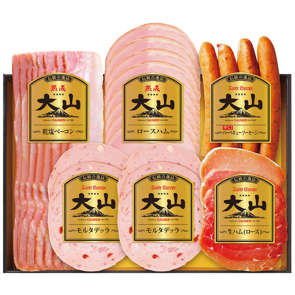 熟成乾塩ベーコン 115g、生ハム(ロース) 40g、熟成ロースハム 106g、バーベキューソーセージ 120g、モルタデッラ 56g×2