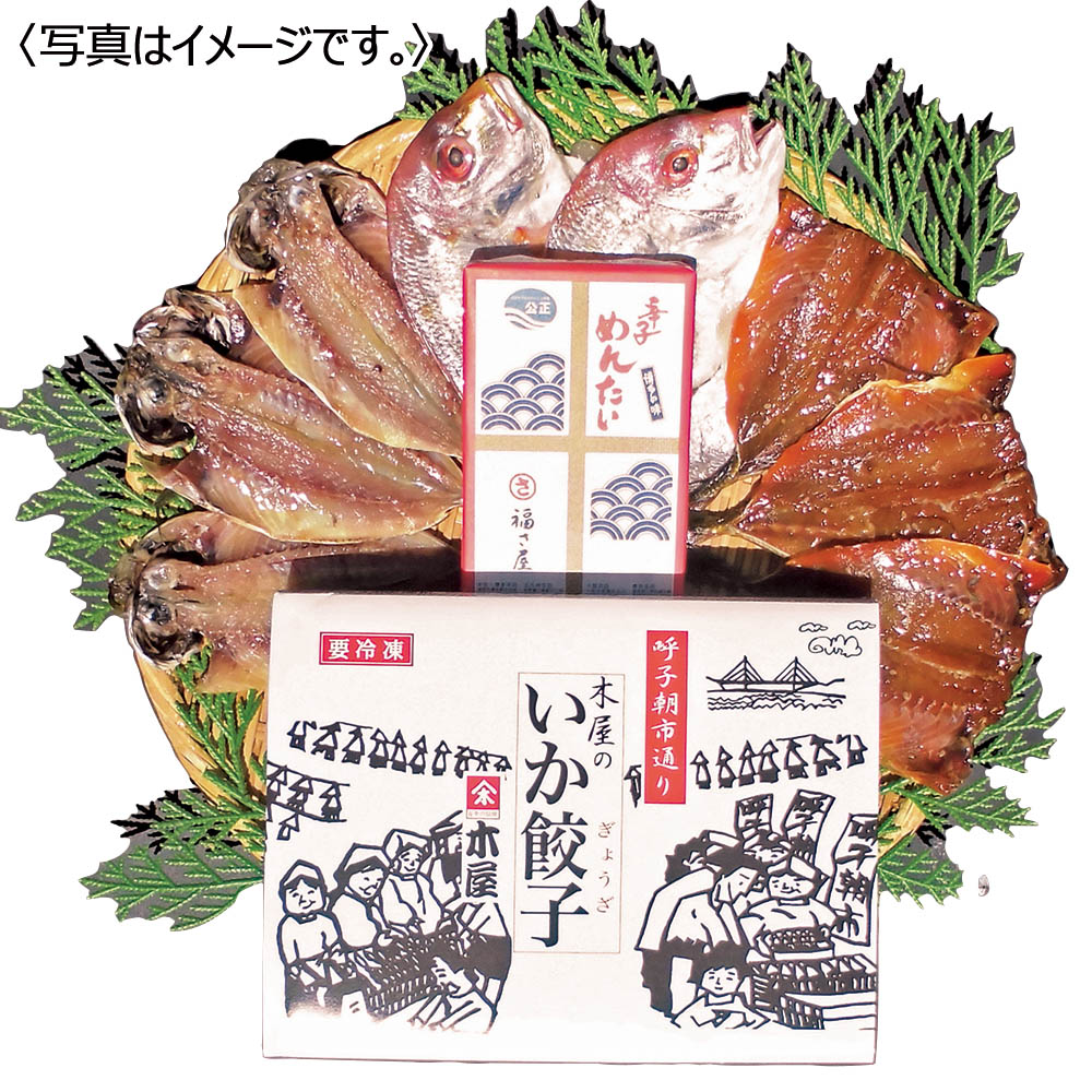 いか餃子 15個入、あじみりん干し・あじ開き×各3、連子鯛×2、福さ屋辛子明太子(中辛) 90g