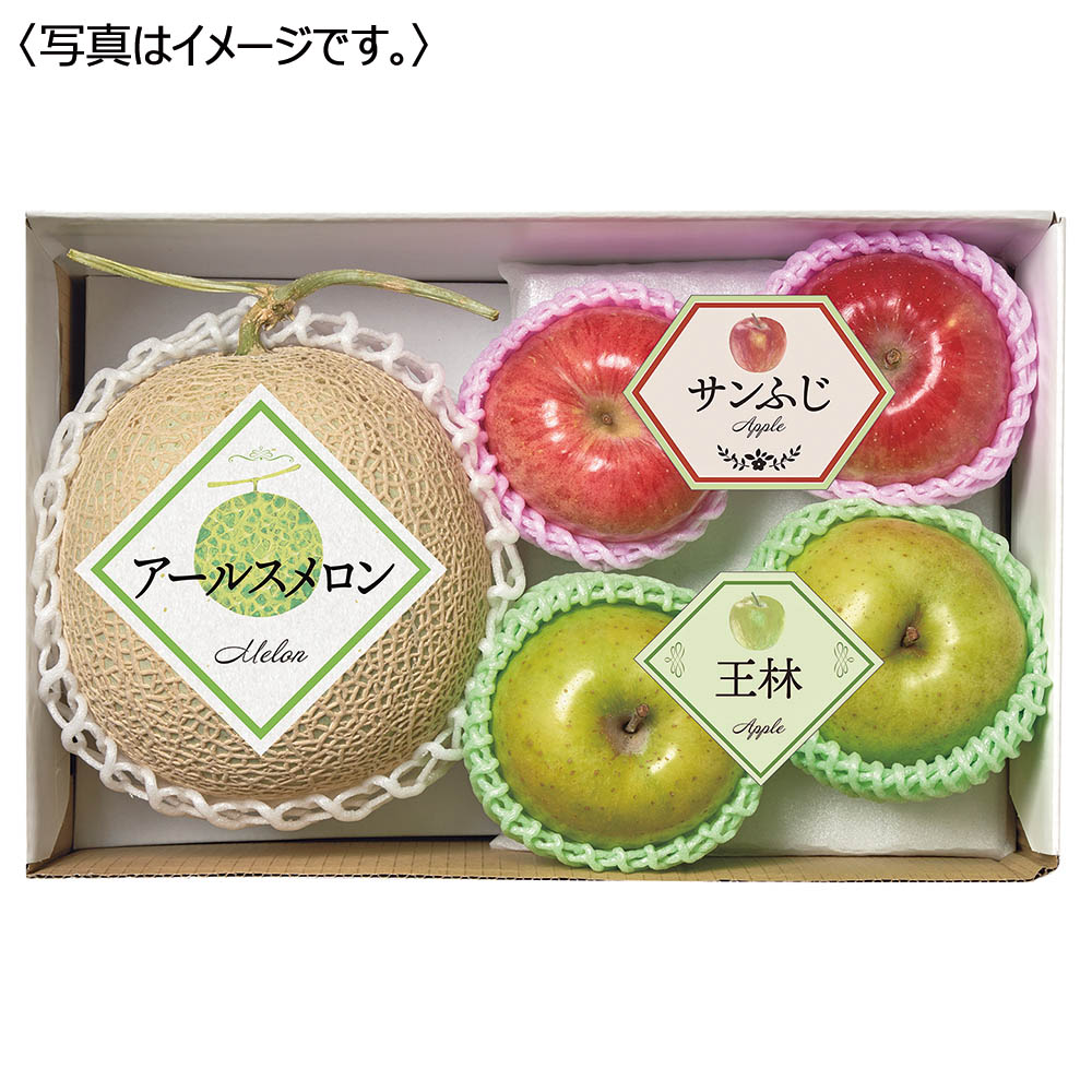 アールスメロン 約1.2kg(熊本県産)、サンふじ 約250g×2玉(青森県産)、王林 約250g×2玉(青森県産)