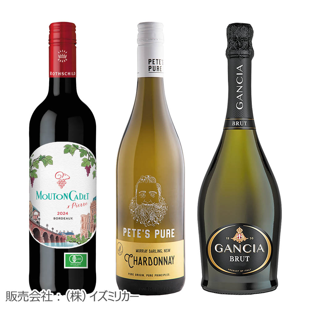 ムートン・カデ・ルージュ・オーガニック・バイ・ピエール 750ml、ピーツ・ピュア・シャルドネ 750ml、ガンチア・ブリュット 750ml