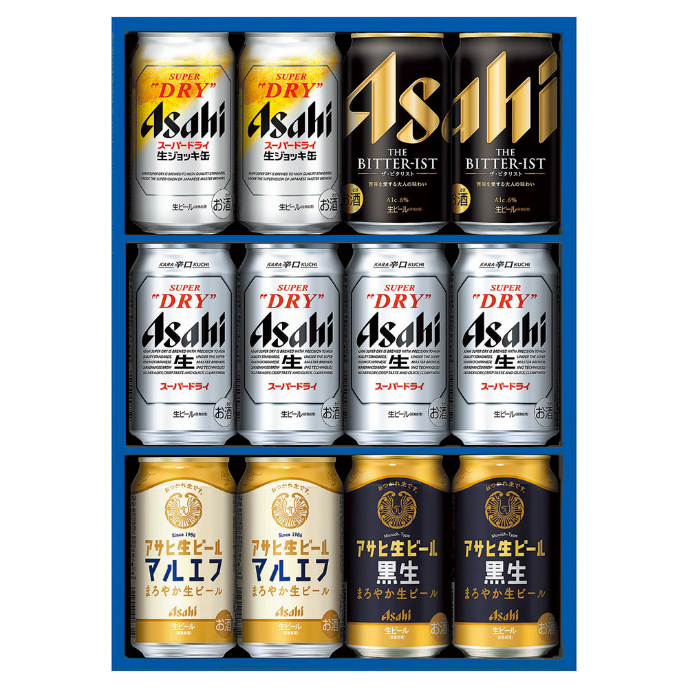 スーパードライ 350ml×4、アサヒ生ビール・黒生・ザ・ビタリスト 各350ml×2、スーパードライ 生ジョッキ缶 340ml×2
