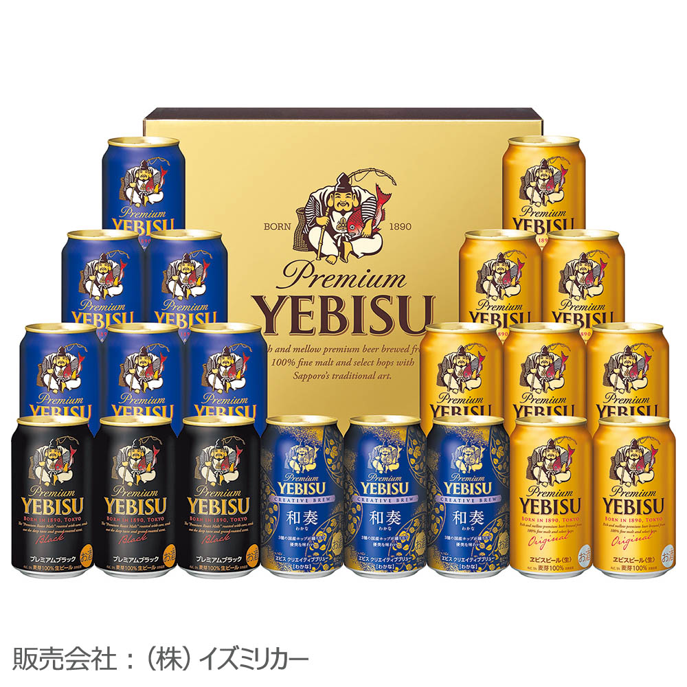 ヱビスビール缶 350ml×8、ヱビス和奏缶・プレミアムブラック缶 各350ml×3、プレミアムエール缶 350ml×6