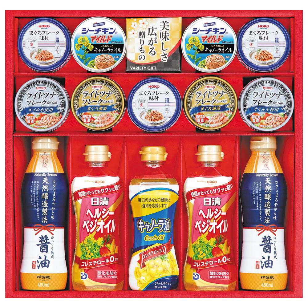 日清ヘルシーベジオイル 350g×2、キャノーラ油 350g、はごろもシーチキンマイルドキャノーラ 70g×2、宝幸(まぐろフレーク味付 70g×3、ライトツナフレークまぐろ油漬・ライトツナフレークオイル不使用 各70g×2)、伊賀越天然醸造醤油 450ml×2