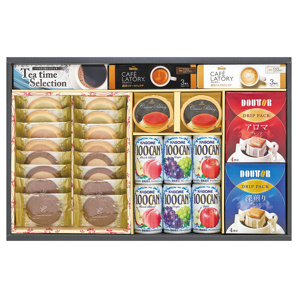 ドトールドリップパック(アロマブレンド 7g・深煎りブレンド 7g)×各4、カフェラトリー(濃厚ミルク 10.5g・濃厚ビター 9g)×各3、チョコクッキー×4、モザイククッキー(バニラ&イチゴ・バニラ&抹茶・チョコ&ブルーベリー)×4、カスタードプリン75g×2、カゴメ100CAN(アップル・グレープ・ピーチブレンド 各160g×2)