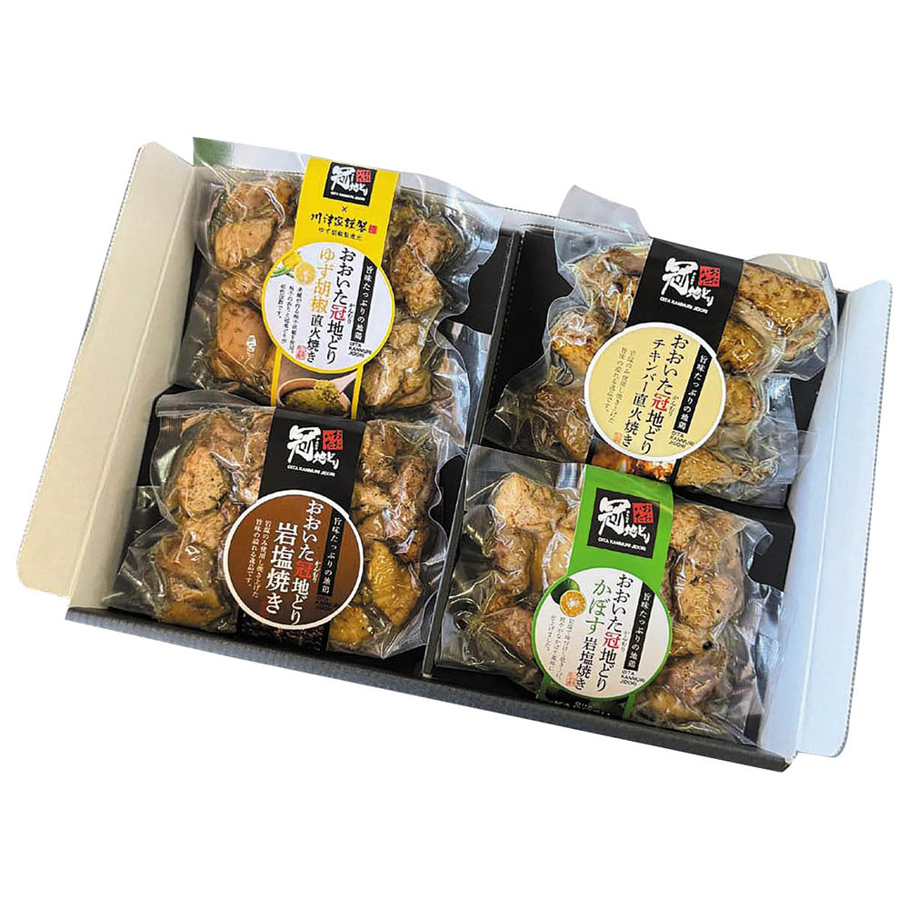冠地どり岩塩焼き・冠地どり柚子胡椒岩塩焼き・冠地どりかぼす岩塩焼き 各120g、冠地どりチキンバー直火焼き 150g