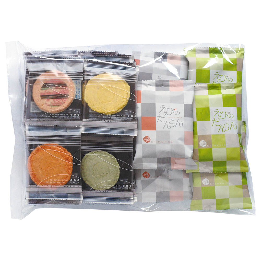 えびのだんらん・白色のえびせんべい・橙色のえびせんべい×各6、のりえびせん・黒ごまえび煎餅・ふた焼ごま・えび柚子胡椒×各4、紅白せんべいチーズサンド・えび小笹×各3