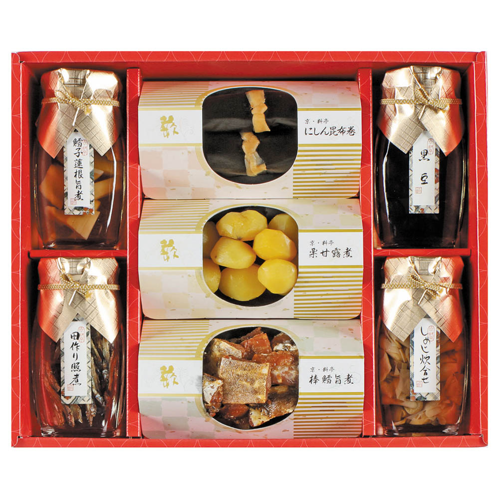 にしん昆布巻×2、栗甘露煮 55g、棒鱈旨煮 85g、黒豆 45g、田作り照煮 20g、しめじ炊合せ 50g、鱈子蓮根旨煮 40g