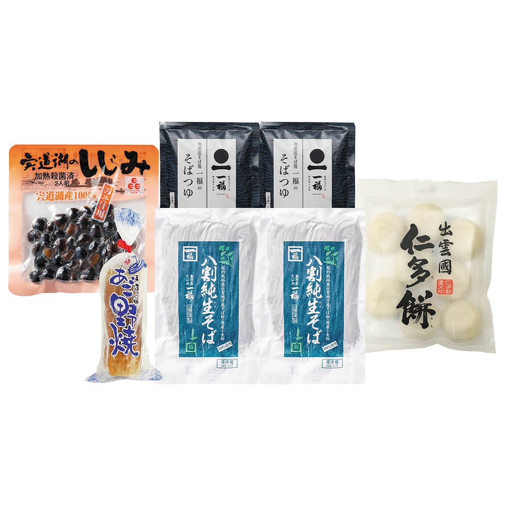 八割生そば 240g×2、そばつゆ 150g×2、仁多餅 300g、宍道湖のしじみ 100g、野焼き 1本