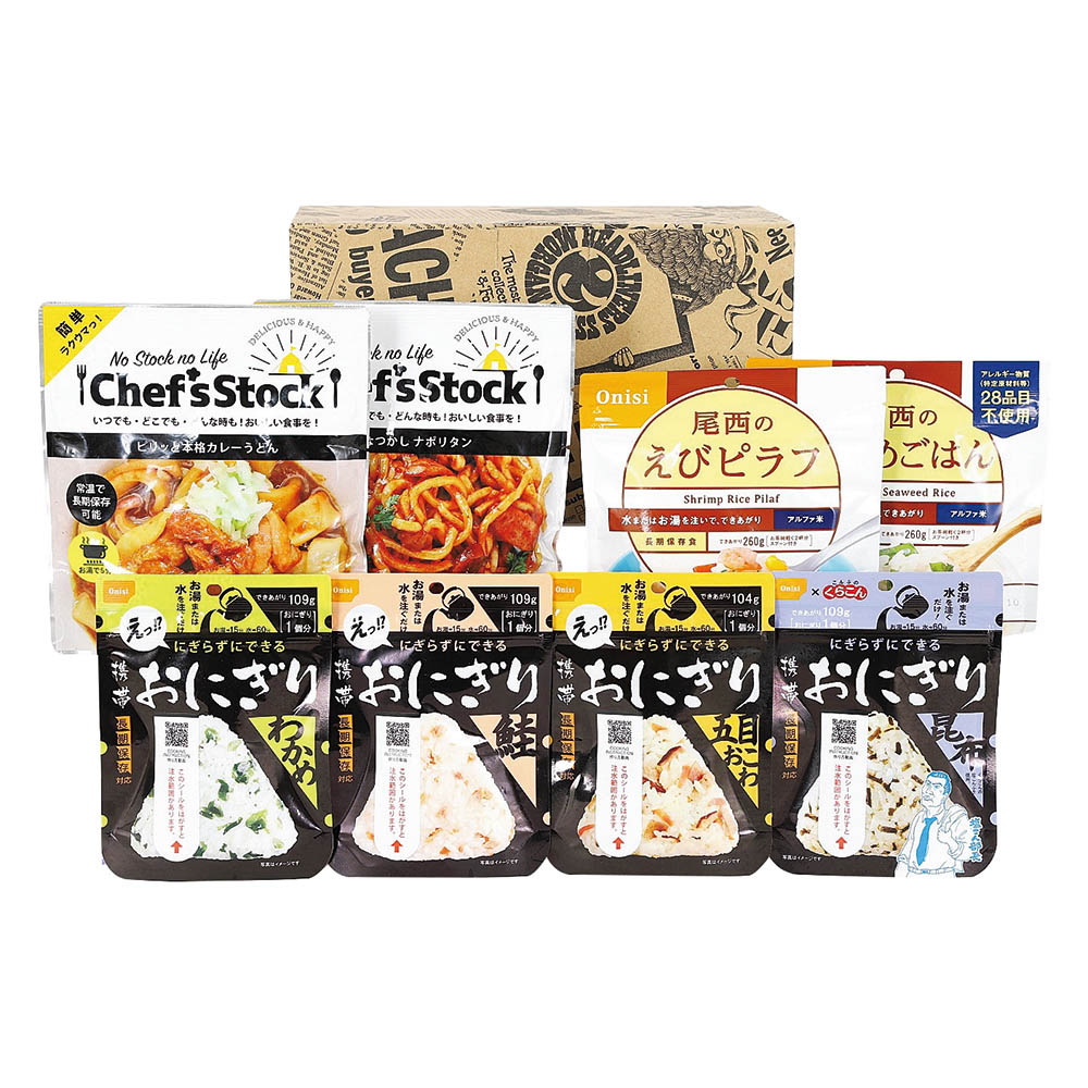 Chef’sStock(昔なつかしナポリタン 230g・ピリッと本格カレーうどん 250g)、尾西のわかめごはん・尾西のえびピラフ 各100g、携帯おにぎり(鮭・わかめ・昆布 各42g、五目おこわ 45g)※Chef’sStockは湯煎5分で食べられます