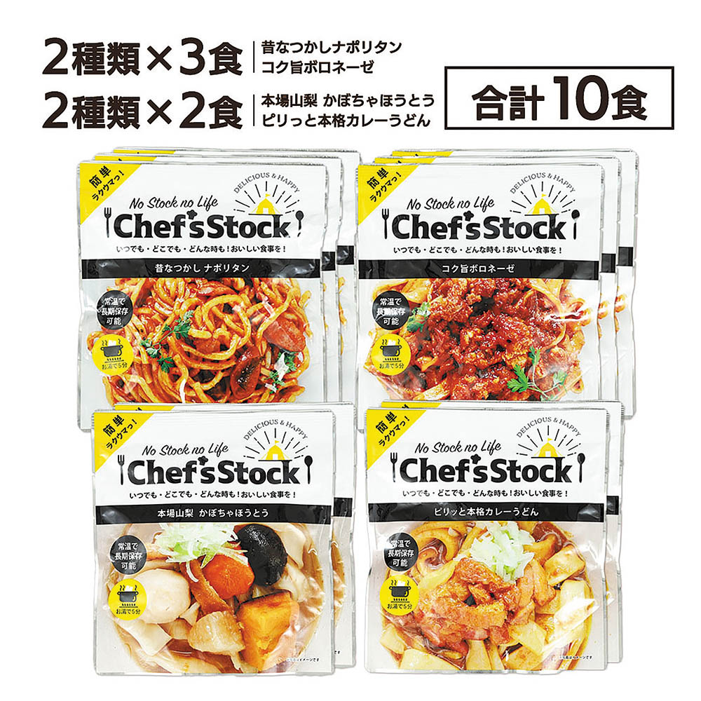 Chef’sStock(コク旨ボロネーゼ 240g×3、昔なつかしナポリタン 230g×3、本場山梨かぼちゃほうとう 310g×2、ピリッと本格カレーうどん 250g×2)