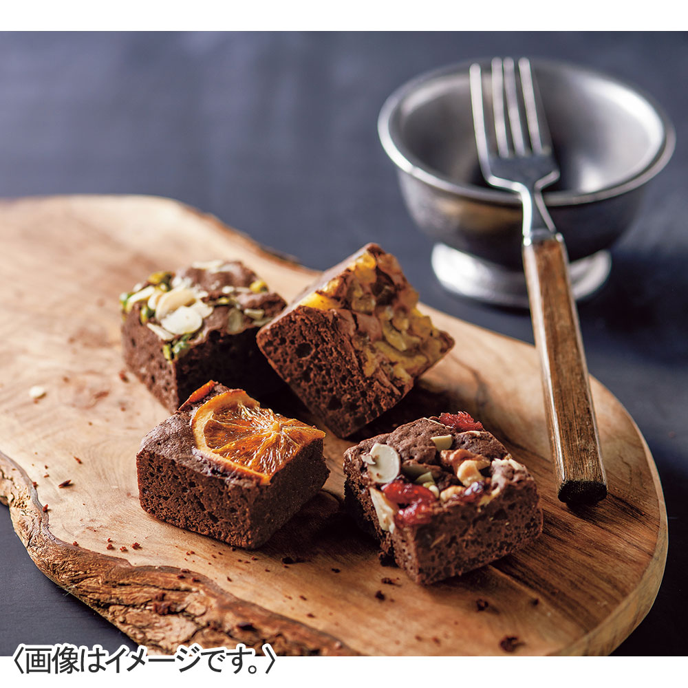 濃厚なチョコレートの生地に、香ばしいナッツや甘酸っぱいフルーツをトッピング。ピスタチオとアーモンド、ごろっとしたパイナップルやネーブル、たっぷりのドライフルーツとナッツ…。おいしさをぎゅっと詰め込んだキューブが、お口に小さなしあわせをお届けします。